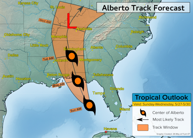 Landfall is expected between Mobile, Alabama and Apalachicola, Florida Monday afternoon or evening. A storm surge of up to 4 feet is expected near and just to the east of Alberto’s center.