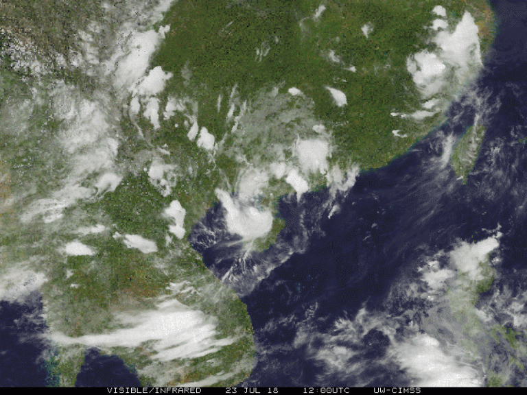 Tropical Storm Son-Tinh developed last week over the Western Pacific. The storm never gained much intensity as it moved west, skirting the northern Phillippines before crossing over China’s Hainan Island. It gained some strength, though, as it crossed the Gulf of Tonkin on 18-July. At the same time it slowed down and performed a three-day loop over northern Vietnam and adjacent Laos. The storm has been persistent and is now moving back over Hainan Island as of Tuesday morning.