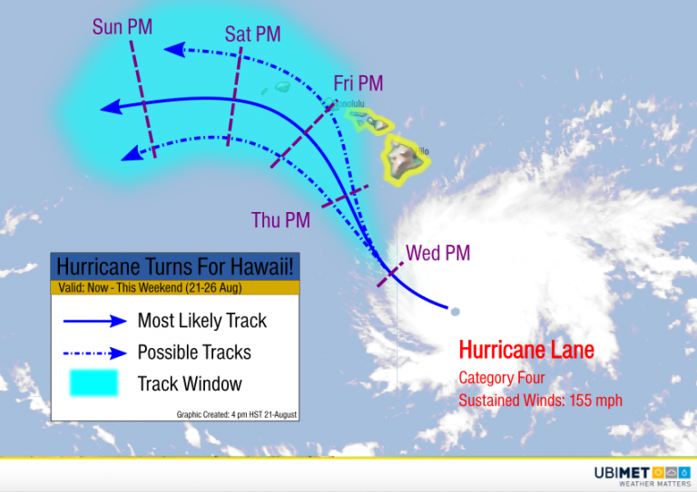 Hurricane watches have been posted by the National Hurricane Center for the islands south of Oahu. Additional watches and warnings are likely in the next few days. Lane is moving west-northwest but is expected to turn more northwest on Wednesday. By Thursday into Friday, the hurricane will be nearing the main Hawaiian Islands, including Maui and the Big Island. Eventually the cyclone will turn more to the west, but it’s not clear whether this turn will take place before or after passing through the islands.
