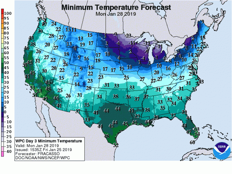 A steady supply of frigid Arctic air is streaming down from the high latitudes towards central and eastern portions of the Lower 48. A large, deep upper level trough is providing the pipeline. One last batch of this Arctic air will move into the Upper Midwest early next week, spreading across the Great Lakes and Northeast by mid-week (see animation at top). Many areas will stay well below zero ˚F (-18 ˚C) for several days. In the case of International Falls, MN, at the border with Canada, the streak of subzero temperatures could reach eight or nine days (see forecast graphic below). Some locations will see record-threatening morning lows as low as minus 45 ˚F (-43 ˚C)! Needless to say, cold of this magnitude is dangerous and potentially deadly. Fortunately, it appears that the pattern will change with warmer weather likely the week after next.