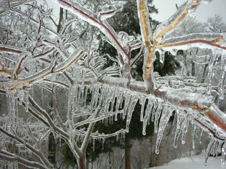 The Arctic air mass that has creeped south into the Central Plains is very shallow. Not far above the surface, temperatures are much warmer, well above freezing. The map below shows the freezing line not only at the surface (in blue) but at 5,000 feet (in purple). In between these lines, rain is falling into surface temperatures below freezing, in some areas well below freezing in the teens and lower 20s. The rain is thus freezing at it reaches the surface, creating a dangerous glaze of ice. Some locations within the pink shading will see ice accumulation up to 0.5 inch through midday Thursday. Travel will be quite dangerous and should be avoided if at all possible. Scattered power outages will also be a threat as ice-laden tree branches and power lines come down. Lead photo courtesy flickr contributor Alan Light.